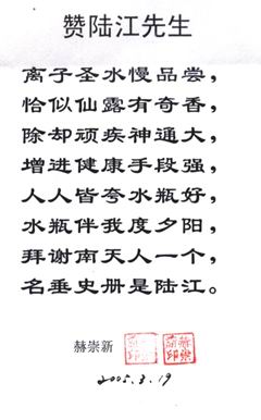 -----我是從事建筑的高工,本來沒有資格去攻克醫(yī)學(xué)難題,卻為了自身健康才扣響醫(yī)學(xué)的大門。由于我1990年患高血壓,因怕中風(fēng)才研究發(fā)明了離子水瓶,我把水處理成微小分子團(tuán)水,飲用后治愈了高血壓。便于1993年底送到三家省級(jí)醫(yī)院做臨床試用4個(gè)月。經(jīng)北京和廣西醫(yī)學(xué)專家鑒定:"降脂降壓效果好"," 能擴(kuò)大心腦動(dòng)脈流量,改善心腦電圖以及微循環(huán)","對(duì)治療心腦動(dòng)脈粥樣硬化、高血壓、高血脂有良好的醫(yī)療保健作用。""產(chǎn)品的技術(shù)性能和療效達(dá)到了同類產(chǎn)品的國(guó)內(nèi)領(lǐng)先水平,經(jīng)廣西醫(yī)學(xué)科學(xué)情報(bào)研究所檢索,未見國(guó)外有類似報(bào)道。"中國(guó)醫(yī)學(xué)科學(xué)院張正國(guó)教授從美國(guó)國(guó)立醫(yī)學(xué)圖書館數(shù)據(jù)庫(kù)存Medline檢索英俄文資料,均未見類似報(bào)告。2000年上市后,我為了對(duì)消費(fèi)者負(fù)責(zé)而繼續(xù)觀察研究,一直通過《信譽(yù)卡》和《質(zhì)量跟蹤調(diào)查書》向患者承諾療效,請(qǐng)用戶使用6個(gè)月后反饋效果。和脂壓患者飲用2至5個(gè)月內(nèi),消除癥狀,停服藥物,血壓正常;冠心病患者飲用3~5個(gè)月逐漸減輕至消除心絞痛、房顫等癥狀,不再服藥,飲用1年左右心電圖正常,經(jīng)冠脈造影掃描無明顯狹窄,表明冠心病痊愈。大量患者還反映許多衰弱器官被修復(fù),讓前列腺增生、慢性咽喉炎、慢性氣管炎、支氣管炎、慢性胃炎、腸炎和膽囊炎等不藥而愈;2型糖尿病患者是因?yàn)橐葝u衰弱致病,飲用該水半年至一年,逐漸減藥至停藥,血糖尿糖正常,真正治愈2型糖尿病。中風(fēng)后遺癥患者飲用六七個(gè)月,可逐漸減輕至消除肢體和語言障礙,表明飲用該水能讓壽命很長(zhǎng)的神經(jīng)元細(xì)胞逐漸修復(fù),奇跡般地恢復(fù)肢體和語言功能。飲用后還使胸腺和脾臟兩個(gè)重要的免疫器官被修復(fù)和增強(qiáng),產(chǎn)生免疫細(xì)胞多,提高了免疫力,使人不生病或少生病。自此, 飲用微小分子團(tuán)水創(chuàng)造了攻克冠心病、高(低)血壓和糖尿病三大醫(yī)學(xué)難題的奇跡。人們對(duì)此感到不可思議,但實(shí)踐是檢驗(yàn)真理的唯一標(biāo)準(zhǔn)。