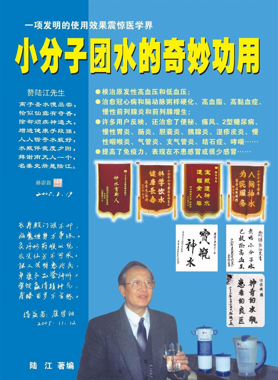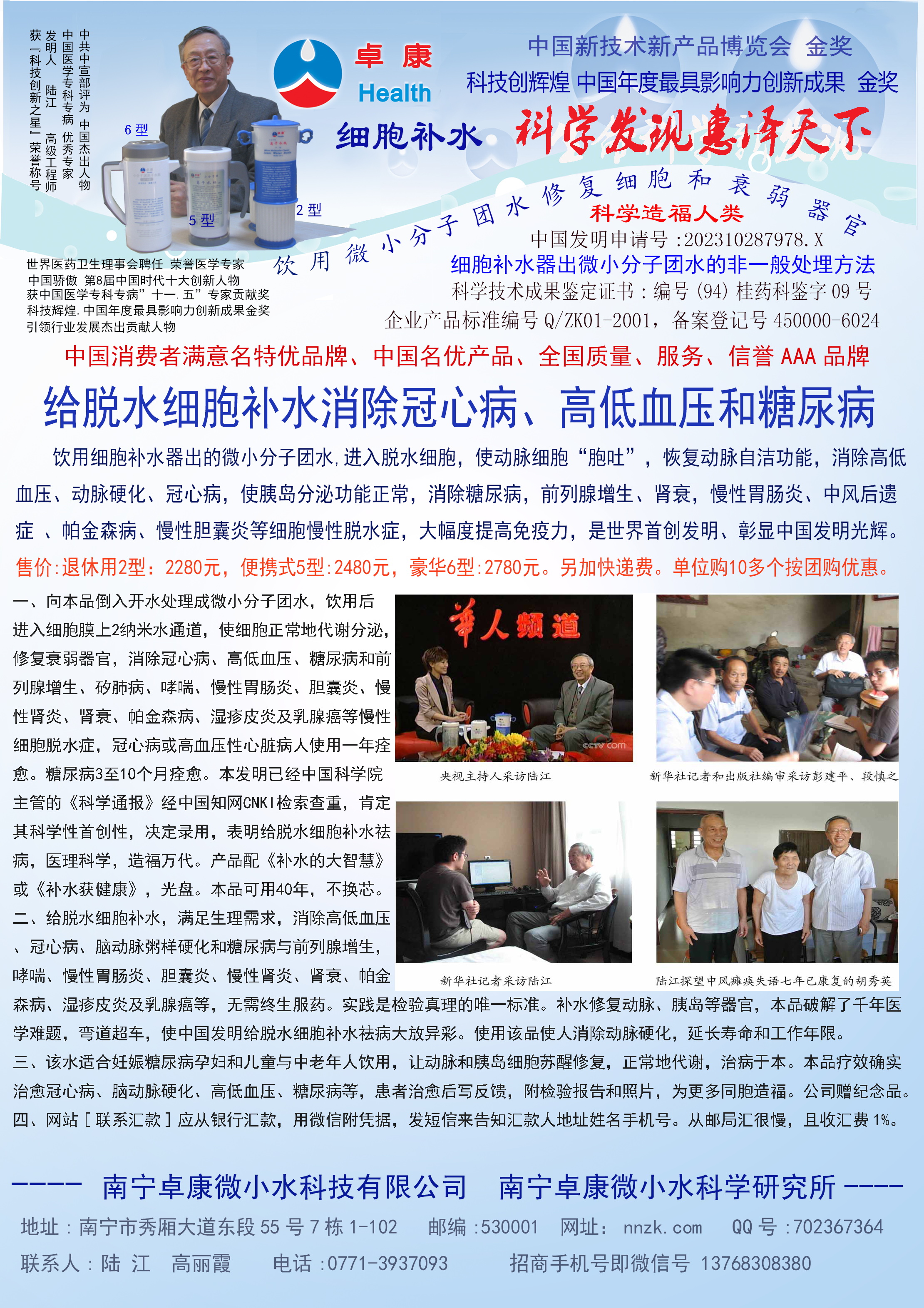 人類幾千年來患以上病癥需終生服藥,幾十年也不能治愈。可是我國(guó)南寧的高級(jí)工程師陸 江,于1990年想根治高血壓,研究發(fā)明了離子水瓶,處理出微小分子團(tuán)水供飲用,經(jīng)過醫(yī)院臨床試用和專家鑒定,1999年獲中國(guó)發(fā)明專利權(quán),產(chǎn)品于2000年投放市場(chǎng)后一直跟蹤調(diào)查,據(jù)全國(guó)各地用戶反饋:祛除了高低血壓、糖尿病和冠心病,并使前列腺增生、咽喉炎、鼻竇炎、慢性氣管炎、支氣管炎、矽肺病、哮喘、慢性胃炎、腸炎、慢性膽囊炎、慢性腎炎、腎衰、膀胱炎、便秘、痔瘡、風(fēng)濕性關(guān)節(jié)炎和濕疹皮炎及中風(fēng)后遺癥等病癥不藥而愈。為什么喝微小水能治20多種病?陸 江從1991年德國(guó)科學(xué)家發(fā)現(xiàn)細(xì)胞膜水通道僅為2納米獲得啟發(fā),認(rèn)為多種器官患病是因細(xì)胞脫水,不能正常代謝和分裂增殖,才使器官細(xì)胞減少致衰弱萎縮而形成細(xì)胞缺水性病癥。22年來的實(shí)踐有力地支持了“細(xì)胞脫水致病”這一重要論點(diǎn),表明喝微小水可滿足細(xì)胞的生理需求,補(bǔ)水就能祛病,是生命科學(xué)新亮點(diǎn)。